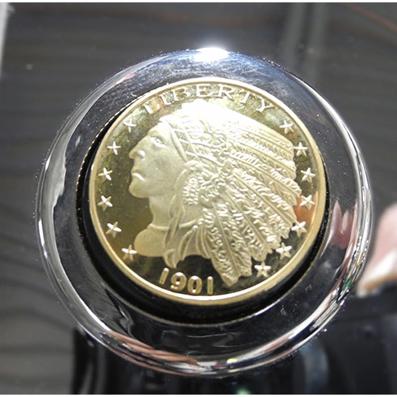 Exclusively created for us with the date 1901. This medallion is curved to fit over the power button on the dash or spotlight switch. Looks like the original US gold coin piece in use from 1908 to 1929. Add a small dab of waterproof silicone and apply to button. Be sure to let silicone cure overnight. For more rigid mounding you can use double sided foam tape. Available in 24K gold and chrome.