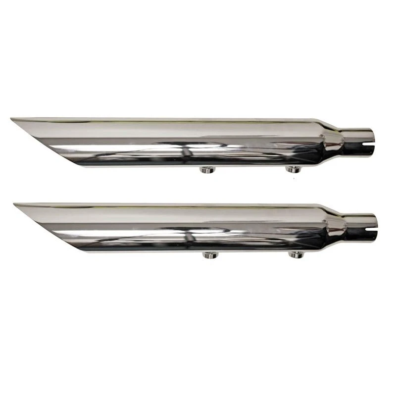 - Slip-on mufflers feature 16-gauge steel construction with polished chrome finish