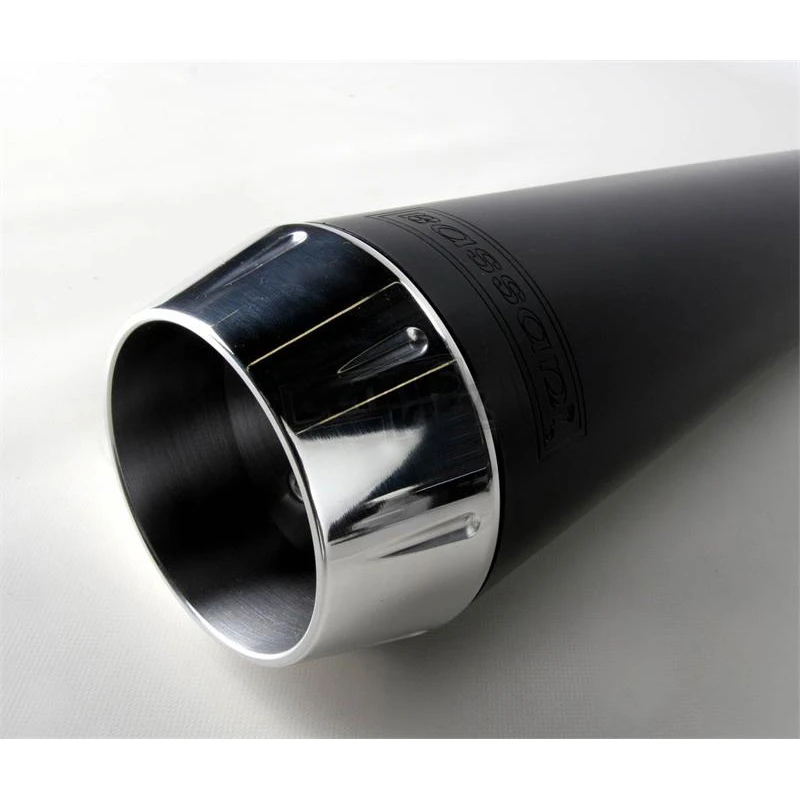 - Stepped headers, true reverse-cone megaphone muffler and a removable baffle with a polished billet end cap