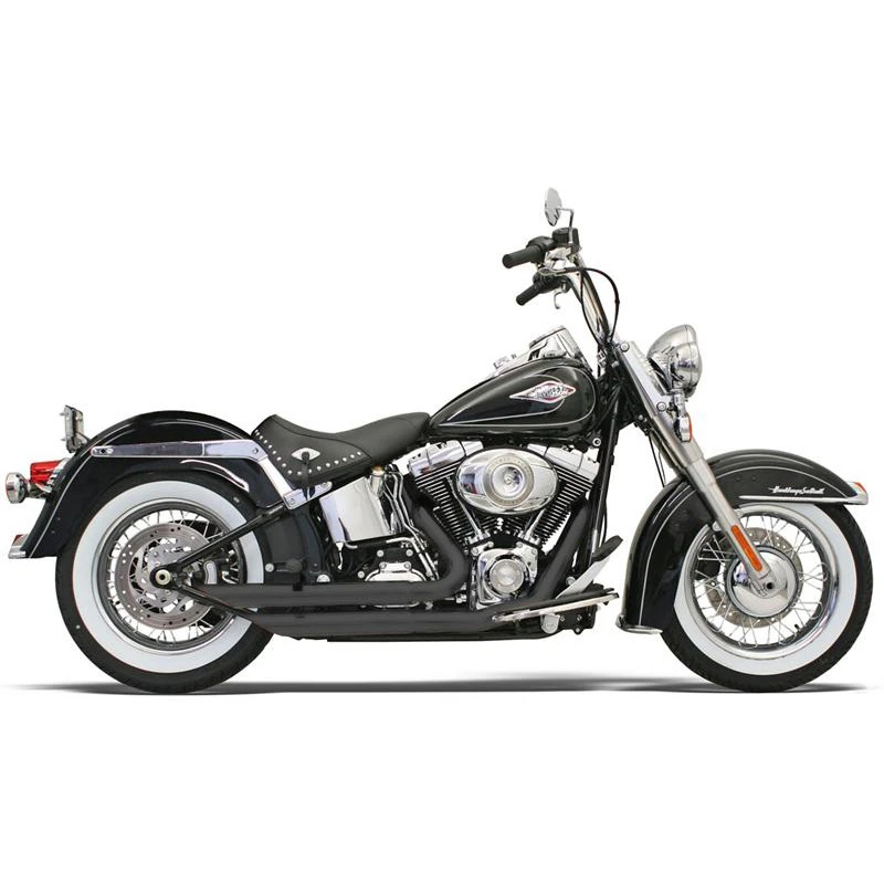 2:1 Performance exhaust system featuring stepped headers, true reverse cone megaphone muffler and a removable core with a billet end cap. Come with Full heat shields available for most models. Moderately aggresive exhaust note. PRO STREETS for all softail models. Shotgun design featuring stepped headpipes and tunable/replaceable flow-through baffles. Avialable in different styles such as turn out ends or with billet end caps. Expect an aggressive sound. Sweeper Style Pipes are a radical radius bent short headpipe with a strong exhaust sound.