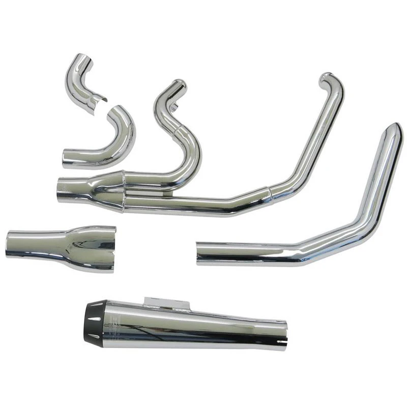 2:1 Performance exhaust system featuring stepped headers, true reverse cone megaphone muffler and a removable core with a billet end cap. Come with Full heat shields available for most models. Moderately aggresive note.
