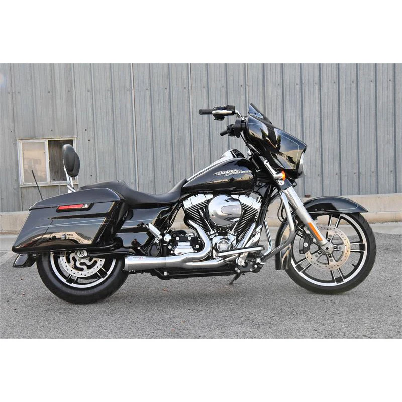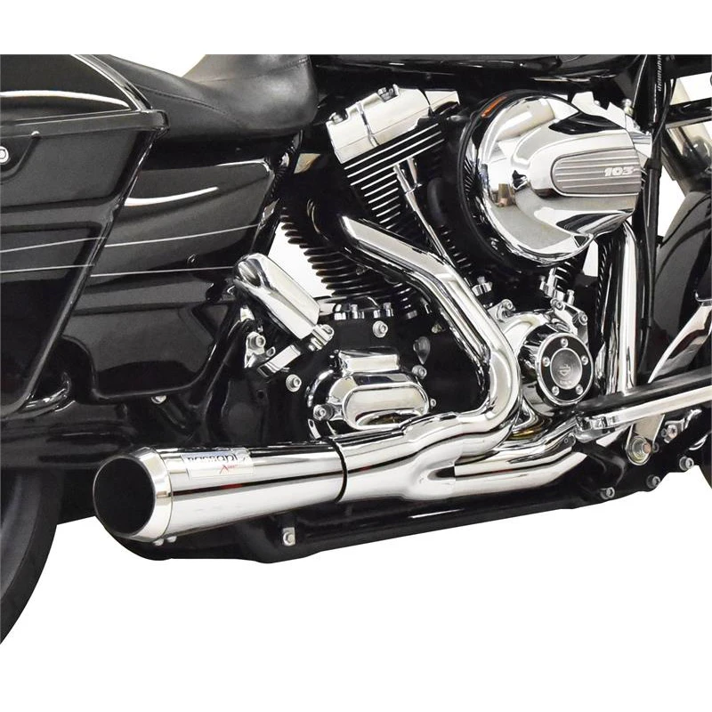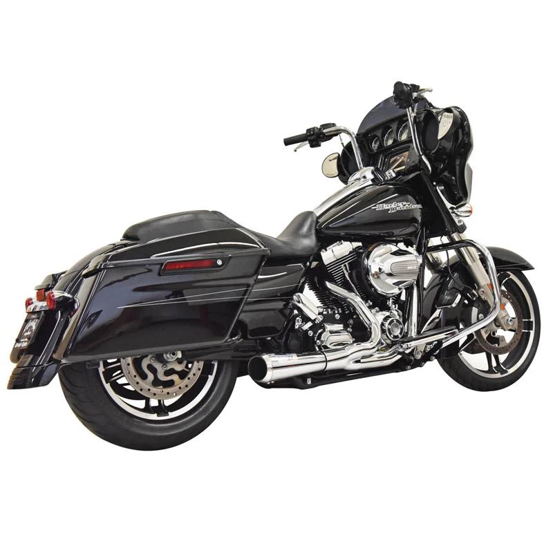 2:1 Performance exhaust systems feature stepped headers, and choice of muffler options with either a true reverse cone megaphone muffler or a 4″ straight can muffler with a removable core with and polished billet end cap. Heat shields available for most models.Harley® riders can realize the benefits of a “True Dual” crossover system that performs as good as it looks. Bassani’s “True Dual” Power Curve. Designed to give proper port angle and tuned rear pipe length. The Bassani Power Curve offers improved low-end torque, appearance and an unmistakable exhaust tone.