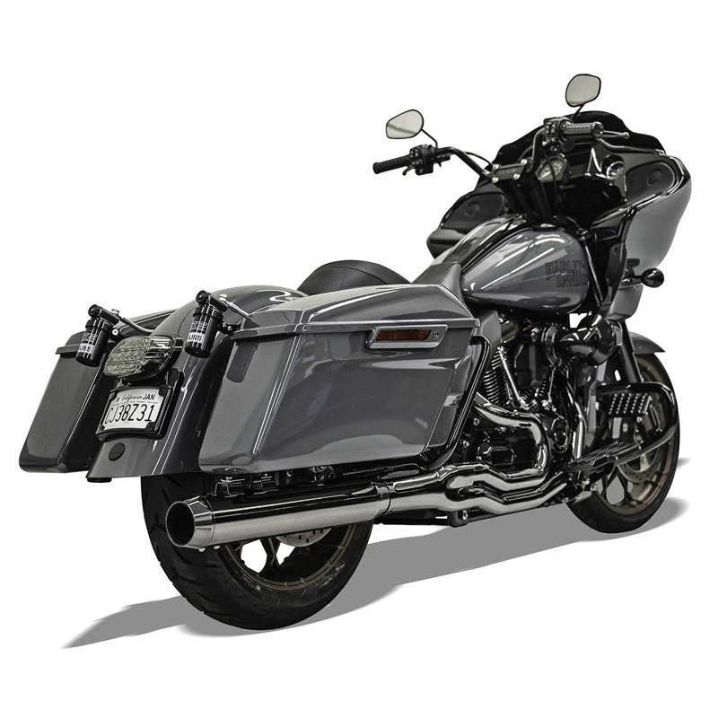 - Stepped headers merge into a true reverse-cone 4″ Straight Can muffler