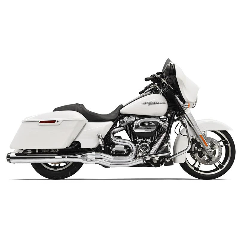 2:1 Performance exhaust systems feature stepped headers, and choice of muffler options with either a true reverse cone megaphone muffler or a 4″ straight can muffler with a removable core with and polished billet end cap. Heat shields available for most models.Harley® riders can realize the benefits of a “True Dual” crossover system that performs as good as it looks. Bassani’s “True Dual” Power Curve. Designed to give proper port angle and tuned rear pipe length. The Bassani Power Curve offers improved low-end torque, appearance and an unmistakable exhaust tone.