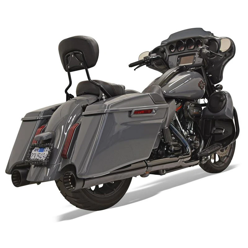 SLIP-ON Mufflers for Road King®, Road Glide®, Dresser and Twin Cam 88® models and later. Slip-on mufflers for touring models are available in five styles; slash cut, straight cut, slice cut, slant cut, megaphone and a 4″ straight can. Mufflers feature 4″ diameter 16 guage steel construction with tunable and replaceable flow-through baffles. Mufflers are finished in a show-quality chrome finish.