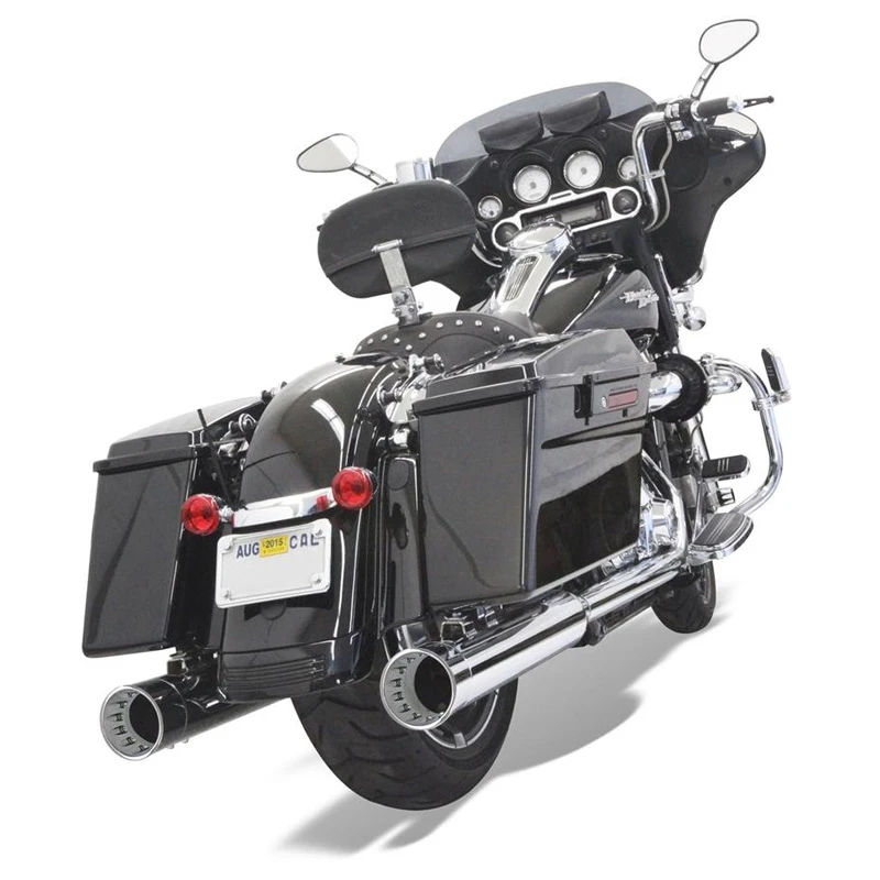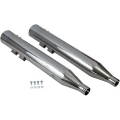 SLIP-ON Mufflers for Road King®, Road Glide®, Dresser and Twin Cam 88® models and later. Slip-on mufflers for touring models are available in five styles; slash cut, straight cut, slice cut, slant cut, megaphone and a 4″ straight can. Mufflers feature 4″ diameter 16 guage steel construction with tunable and replaceable flow-through baffles. Mufflers are finished in a show-quality chrome finish.