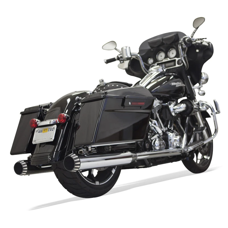 SLIP-ON Mufflers for Road King®, Road Glide®, Dresser and Twin Cam 88® models and later. Slip-on mufflers for touring models are available in five styles; slash cut, straight cut, slice cut, slant cut, megaphone and a 4″ straight can. Mufflers feature 4″ diameter 16 guage steel construction with tunable and replaceable flow-through baffles. Mufflers are finished in a show-quality chrome finish.