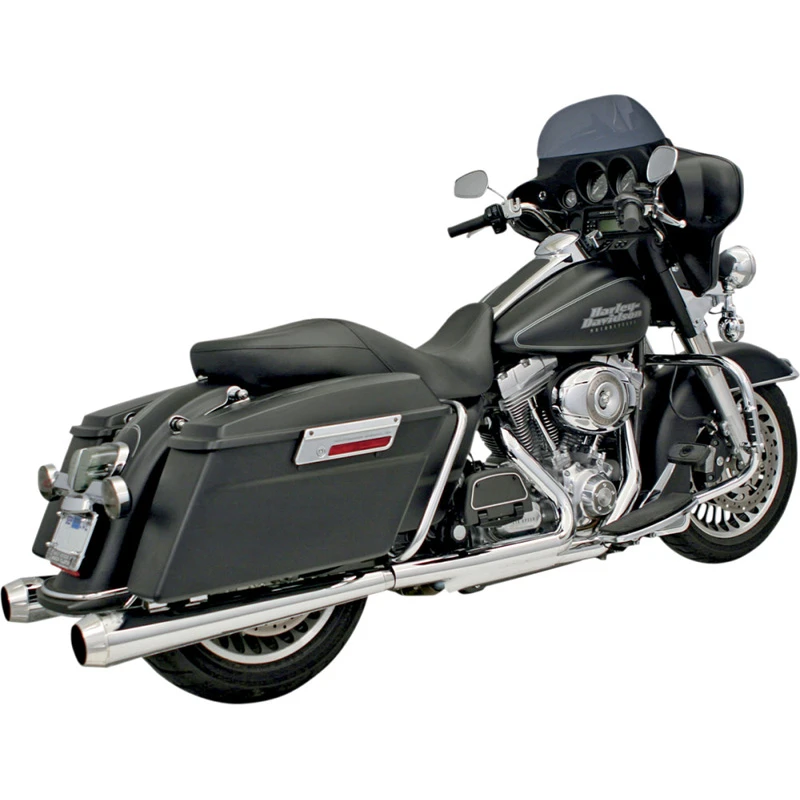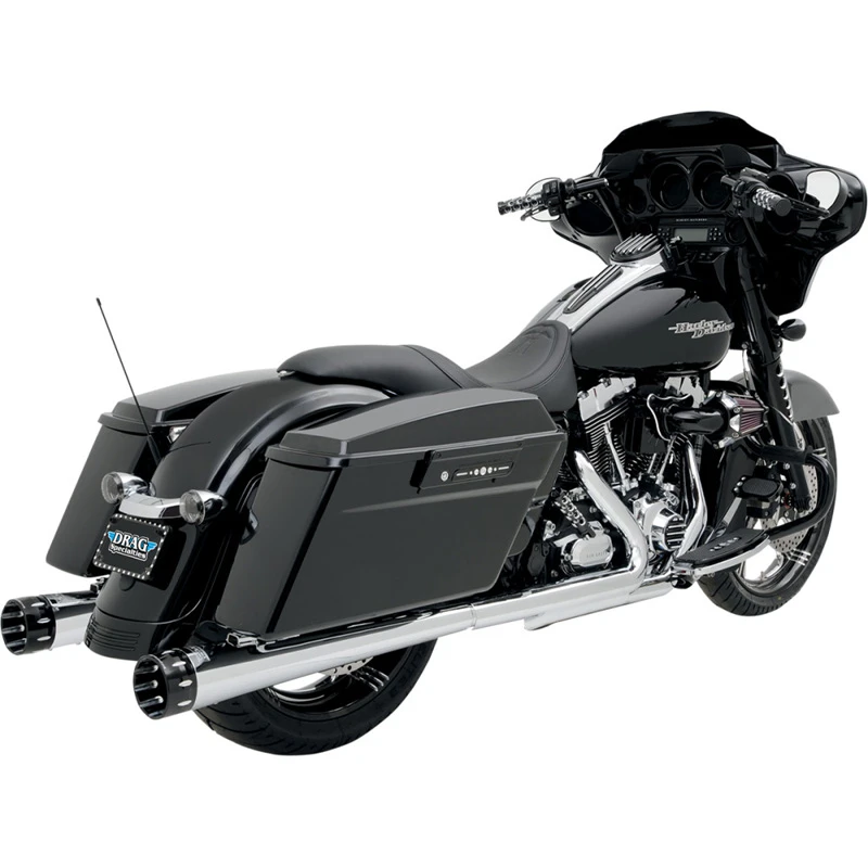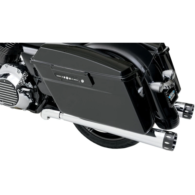 - 4 in. diameter slip-on mufflers feature 16-gauge steel construction, removable flow-through 2 1/2 in. performance baffles and show-chrome finish