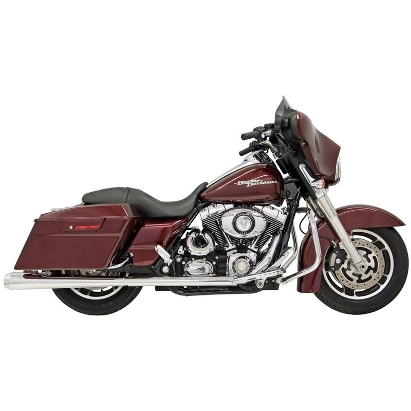 SLIP-ON Mufflers for Road King®, Road Glide®, Dresser and Twin Cam 88® models and later. Slip-on mufflers for touring models are available in five styles; slash cut, straight cut, slice cut, slant cut, megaphone and a 4″ straight can. Mufflers feature 4″ diameter 16 guage steel construction with tunable and replaceable flow-through baffles. Mufflers are finished in a show-quality chrome finish.