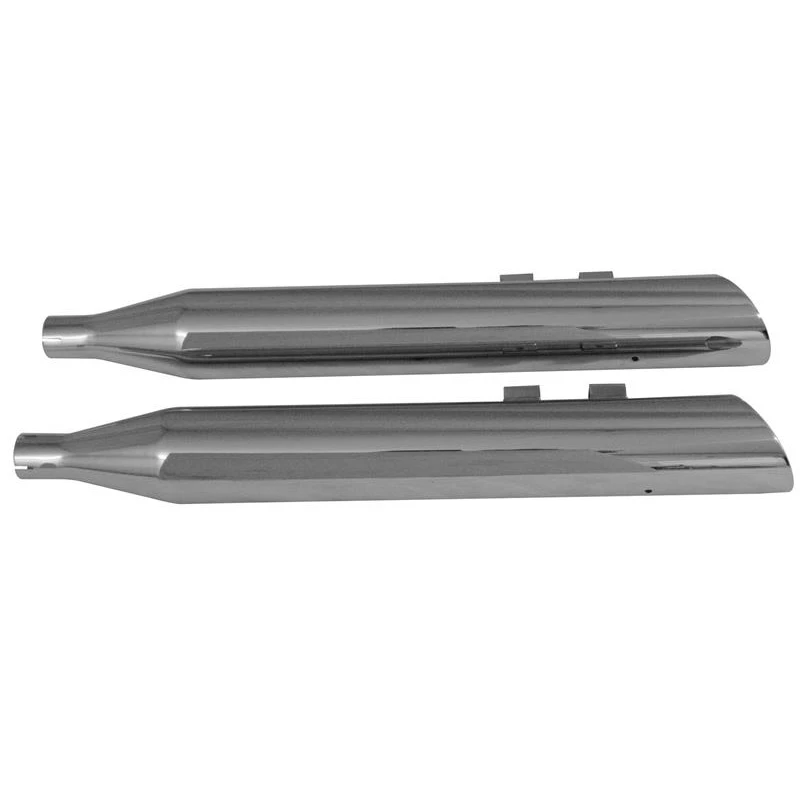 - 4 in. diameter slip-on mufflers feature 16-gauge steel construction, removable flow-through baffles and show-chrome finish