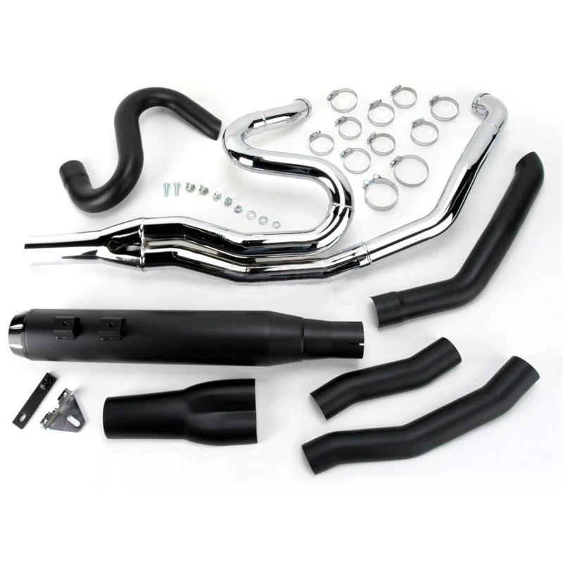 2:1 Performance exhaust systems feature stepped headers, and choice of muffler options with either a true reverse cone megaphone muffler or a 4″ straight can muffler with a removable core with and polished billet end cap. Heat shields available for most models.Harley® riders can realize the benefits of a “True Dual” crossover system that performs as good as it looks. Bassani’s “True Dual” Power Curve. Designed to give proper port angle and tuned rear pipe length. The Bassani Power Curve offers improved low-end torque, appearance and an unmistakable exhaust tone.