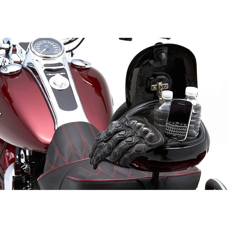 - holds four liters of your travel essentials like water bottles, cell phone and spare gloves. The most convenient storage on the bike!