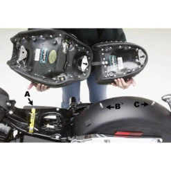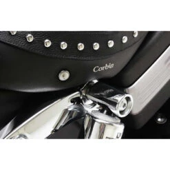 - Classic solo and pillion pad install on a new Corbin keylock system. All brackets and required hardware is included. In image: Solo seat latch bracket “A”, Rear mounting stud for Solo seat “B” and Rear mounting stud for pillion seat “C”.