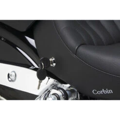 - Classic solo and pillion pad install on a new Corbin keylock system. All brackets and required hardware is included. In image: Solo seat latch bracket “A”, Rear mounting stud for Solo seat “B” and Rear mounting stud for pillion seat “C”.