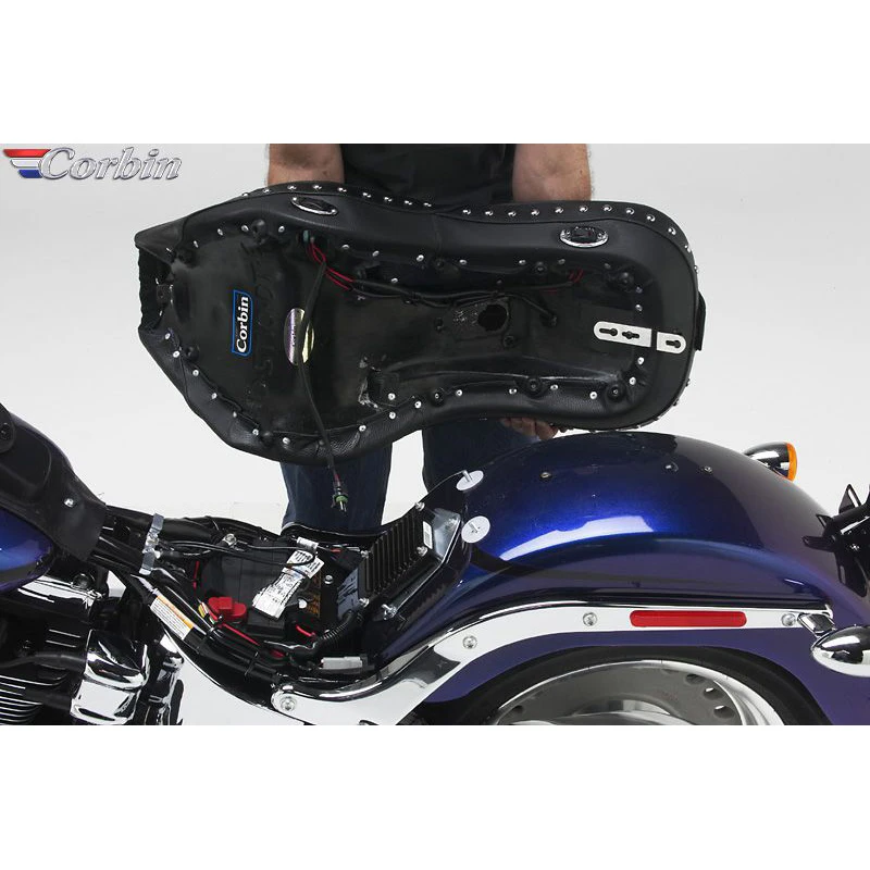 - Installation:Â The Corbin Dual Touring Saddle installs on your bike like stock using a tongue in the front and a single screw into your fender at the rear. Seat heater assembly comes preinstalled on the saddle and ready to go. We supply the wiring pigtail and adapter to connect the seat directly into your stock Harley fusebox.