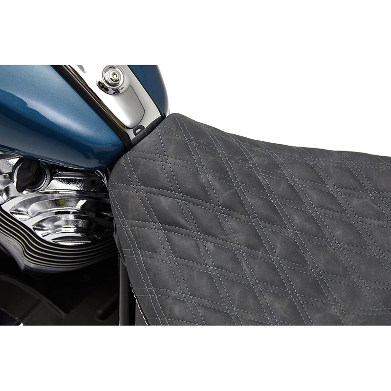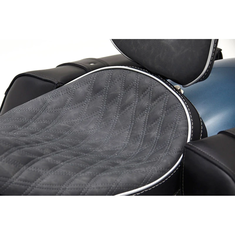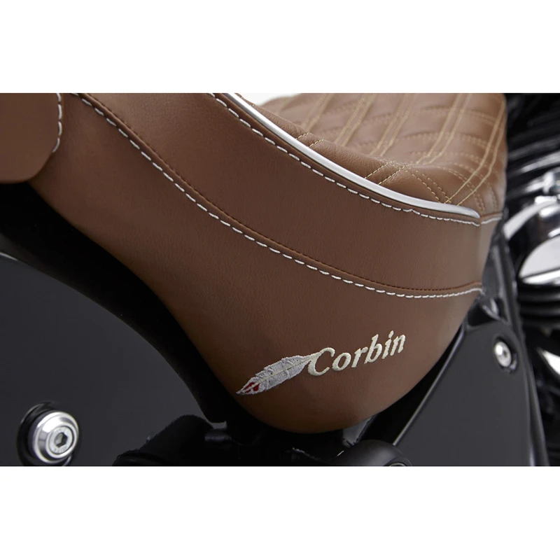 An outstanding classically styled solo seat for the newest Indian Chief. Provides maximum rider comfort combined with classy looks and a range of custom options. Accepts our removable backrest for a total of 13 inches of vertical back support. Our sculpted seating position gives maximized body contact and provides touring quality comfort. Neutralized seat platform offers an ergonomic position for a more integrated feeling with the bike.For your passenger we offer two pillion options that mount up easily to your Indian. Our 50’s pillion keeps a clean, low profile built up with our exclusive Comfort Cell foam to provide good mid-range comfort. Corbin’s Touring Pillion is built wider and thicker with a dished seating platform to provide maximum weight distribution and support. Both come upholstered to match your Corbin solo for a totally integrated look.Corbin pillion pads work with the Indian accessory sissybar for additional passenger comfort and support. Naturally we make a coordinated sissybar pad to complete the look. Our pad is built up with the same high quality materials as the saddles and shaped to emulate the look of the model . Installation is simple and provides a custom fit to the rear bend of the Indian sissybar. is simple to install and adjusts easily to your posture. Just slide the backrest shaft into the internal hardware of the Classic Solo and lock it in place with a single bolt. You can then set the backrest where you want it and lock it in place with the easily accessible adjustment screw… no need to remove the saddle. Choose from a variety of backrest styles to suit your taste although we recommend the  shown above for the perfect balance of looks and support.Classic solo saddle and backrest provide excellent support for riding while the shaping in the nose allows for ground reach at stop signs. We’ve designed our saddle to place the rider in the sweet spot on the bike for the best feeling of control. Neutralized seating area helps you stay firmly planted in the bike without sliding in the saddle.All components use our proprietary high density Comfort Cell foam for a firm supportive ride. Dished shaping provides good contoured support and minimizes the tendency to slide in the saddle. Sculpted to support your body from the sides and eliminate centralized pressure on your tailbone.Choose from a range of leather styles and colors for a custom touch. Leather will provide a perch that breathes with your body and will break in along with the foam shape for a personalized fit. Be sure to care for your leather saddle with a quality conditioner like our Saddle Cream. With proper care, your seat will age gracefully developing a unique character and will be your riding buddy for years.Our #BR model backrests have removable finishing plates on the rear available in a range of styles. The standard plate is an ABS leather look, but we can also provide one with a carbon-fiber look or primer and ready for custom paint. For just a little extra, we can provide the finishing plate on your backrest prepainted gloss black. These make a perfect finishing touch.Cover designs/colors shown above: - Gray Bomber Jacket leather seating, Matte Black sides & stud band, Chrome welt, Medium Silver stitching, White assembly stitching and Champagne Corbin logo.