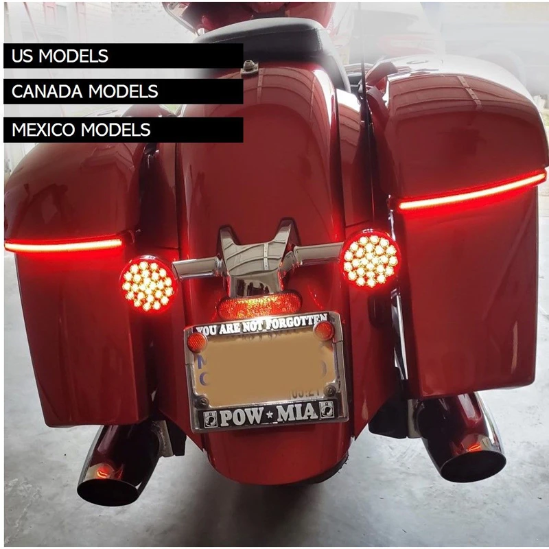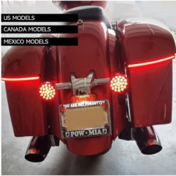 Low Profile BAGZ™ Saddlebag Lights for US & Canada model Indian® Challenger & Pursuit model motorcycles have been designed with a low-profile design to tuck under the lid of the OEM saddlebags. Utilizing super bright red LEDs behind a red or smoked lens the saddlebag lights produce a contrasting red running light with full intensity brake and turn signal (preview). Units come pre-taped for mounting with in-line quick disconnect for quick removal of saddlebags.