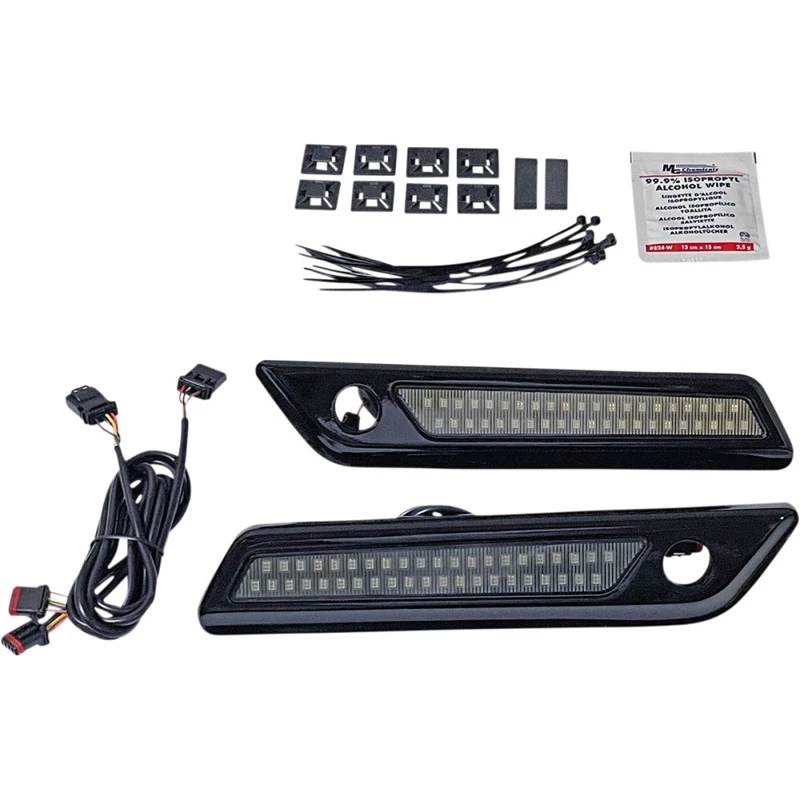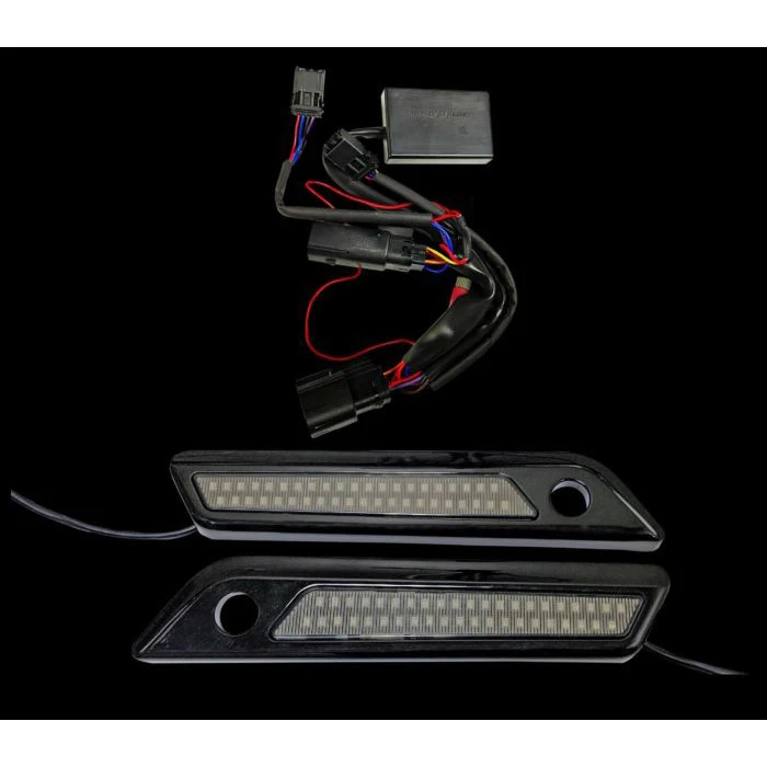 Dual color LEDs embedded behind a red or smoked lens into a durable chrome or gloss black replacement saddlebag latch for 2014-Current Harley-Davidson® Touring models. Complete assembly replaces the OEM saddlebag latch and reflector. Units provide simplified installation for increased side visibility to your motorcycle. Red LEDs illuminate as running and brake light, when turn signal is activated amber LEDs flash for a full contrast turn signal. Included wire harness allows for plug and play installation under the seat.Â