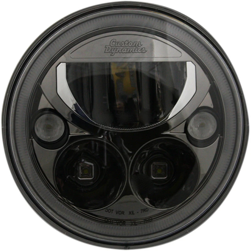 Custom Dynamics® TruBeam Headlamp, Black is our premium 7″ Round LED Headlamp designed for motorcycle use. The complex refplector design features three low beam LEDs and two high beam LEDs with a combination of projector and reflector type LEDs. This comibnation provides superior low and high beam outputs.