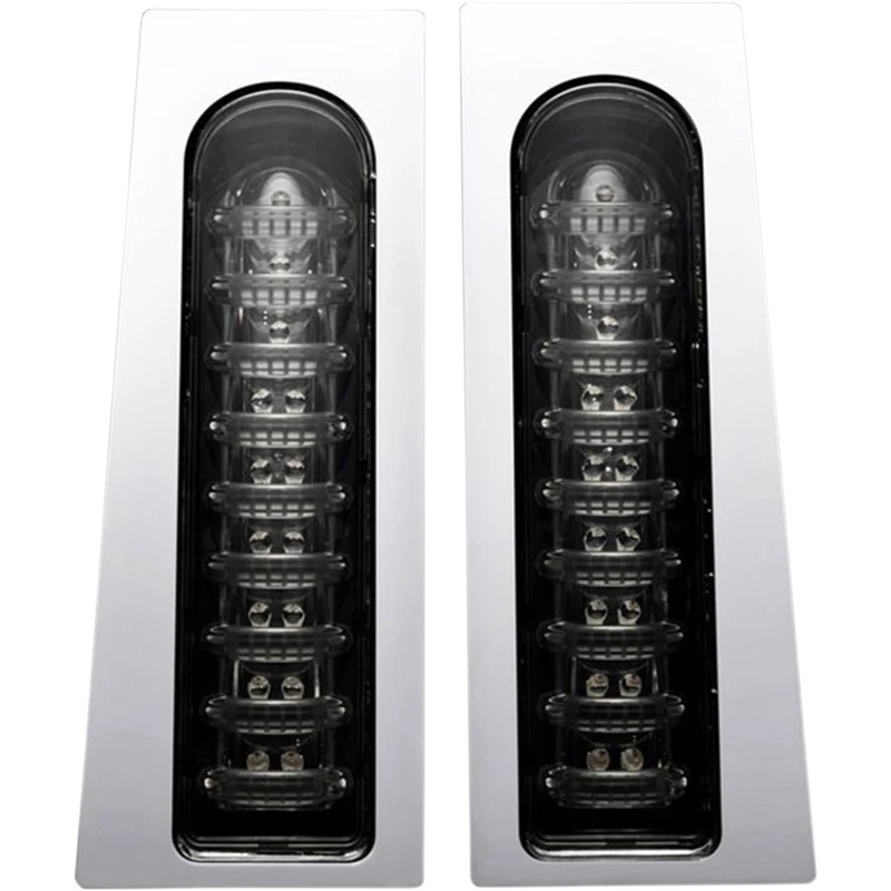 Designed to fill in the stock oval cutout on the 2014-current Harley-Davidson® touring model fender supports. Each unit displays 9 running light pipes for an eye-catching modern style with full contrast turn signal or brake/turn (depending on model). Automotive grade components are completely sealed behind a red or smoked lens with chrome or gloss black trim. Included plug and play adapter makes for quick installation under the seat.