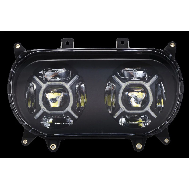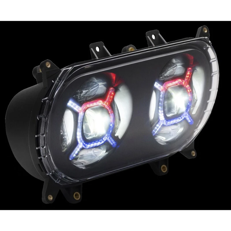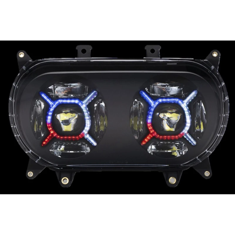 Complete LED headlight assembly is a direct plug and play replacement for OEM Road Glide Headlight. Double lamps within a completely sealed IP67 waterproof housing provide projection style low beam. Eight more LEDs utilize a reflective technology to produce a brilliant 1645 lumen high beam pattern. Double-X pattern color changing lights connect to ProGLOWâ„¢ controller (sold separately) to utilize the most advanced LED color changing technology! Headlight is designed with unique fully accessible adjuster to allow for proper aiming of the headlight after installation. Clear polycarbonate lens is assembled with either a chrome or black reflector. Industry leading technology is utilized for BCM compliance to prevent interference and codes. Lifetime Warranty.Â