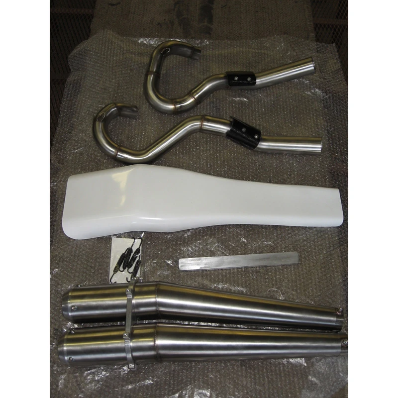 Stepped header design with dual megaphone silencers Stainless system w/ stainless baffles Complete Bolt on kit includes: Front and Rear headers, front and rear megaphone silencers, mounting springs, heat shields, megaphone bracket, number plate, attachment bracket.