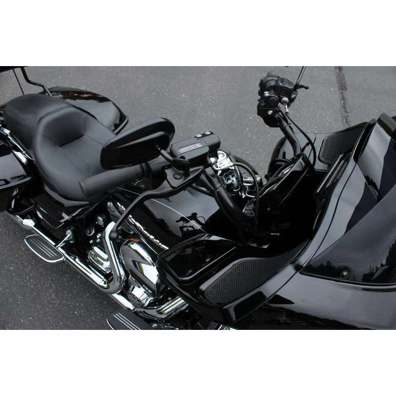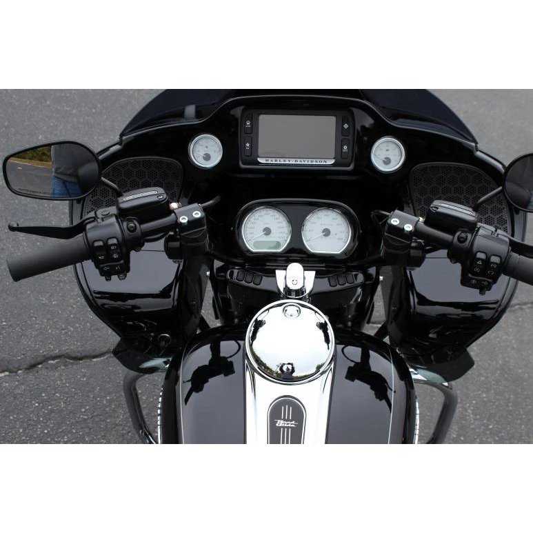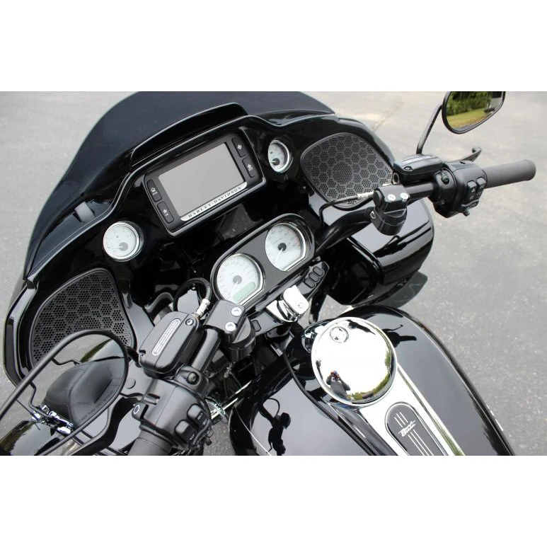 The shape of the Horizon XP / XP2 is visually recommended for larger cruisers which have a relatively open/uncluttered area around the bars (discrete clocks, etc.) and so lends itself nicely to the Harley Davidson Road Glide, Road King and others. Note that Road Glide models up to 2013 require the Horizon XP model as they have a 1″ (25mm) diameter bar.