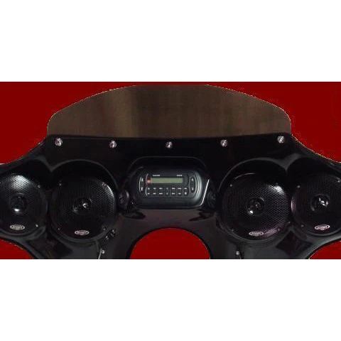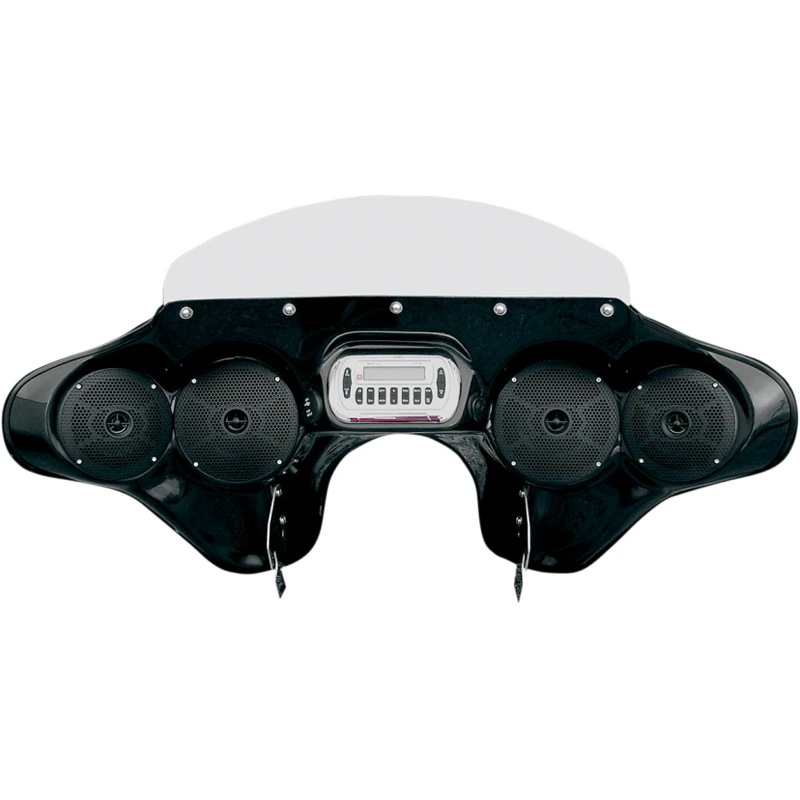 - Integrates with the OEM windshield mounting stampings, using our hardware. (2) 5″ and (2) 6″ coaxial marine speakers for great sound at any speed with any pipes!