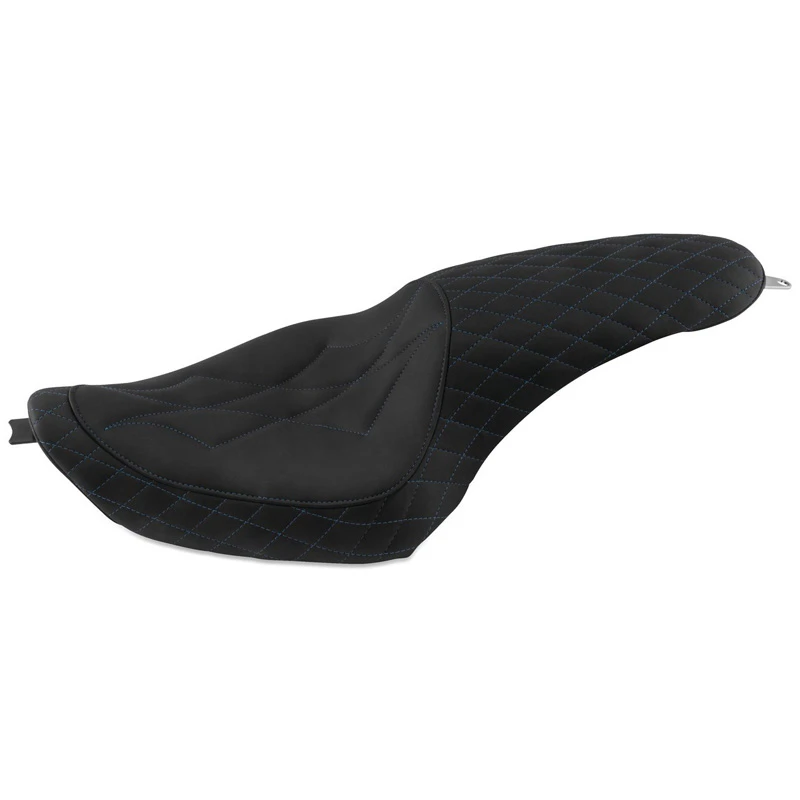 Mustang’s 74101SB Revere Journey Diamond One-Piece Seat, Black with Sky Blue Stitching is made specifically for Harley-Davidson Sportster (2004-2021).