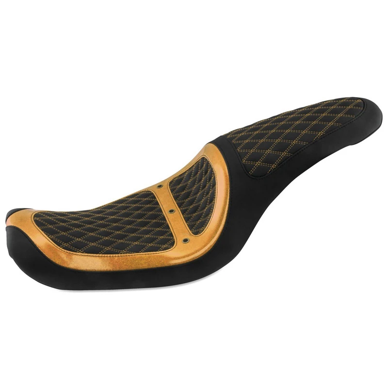 Mustang’s 74106MG Revere Runner Vent One-Piece Seat, Black with Gold Stitching & Gold Metal Flake Accents is made specifically for Harley-Davidson Dyna (2006-2017) models listed below.