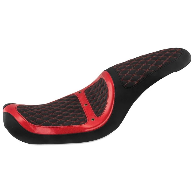 Mustang’s 74106MR Revere Runner Vent One-Piece Seat, Black with Red Stitching & Red Metal Flake Accents is made specifically for Harley-Davidson Dyna (2006-2017) models listed below.