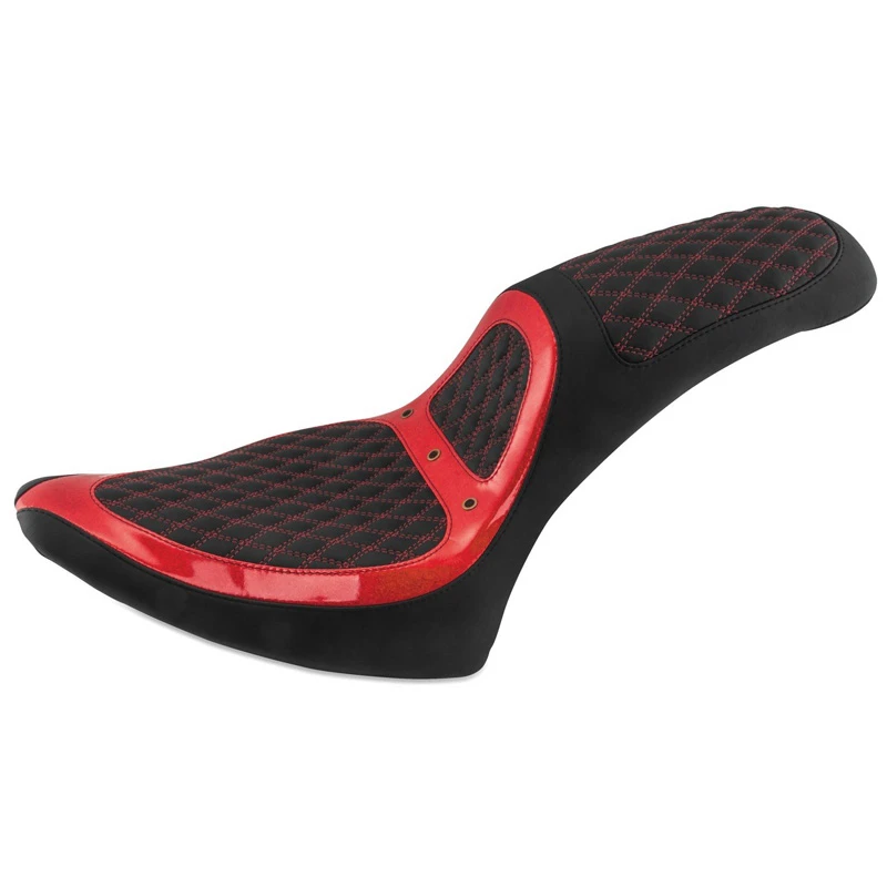 From contrasting diamond stitching to the vinyl inlay with metal flake, the Revere Runner Vent sets the bar for custom show bike style. This low profile and lean seat drops the rider to a comfortable cruising position that’s much lower and slightly further back than stock. A lean 7″ rear width maintains a streamlined appearance while still offering enough comfort for passengers.