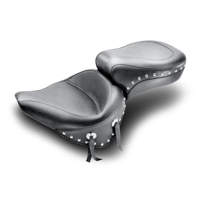 Wide Touring seats feature a wide driver seat that is deeply pocketed and provides ample support. The rear seat also extends forward over the driver’s bucket to give additional back support. The passenger sits comfortably in a full bucket that is shaped like a small solo. The Wide Studded seat features chrome studs all around. The front bucket has a full skirt with braided edge trim and leather tied conchos.