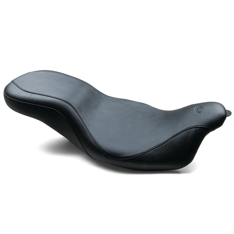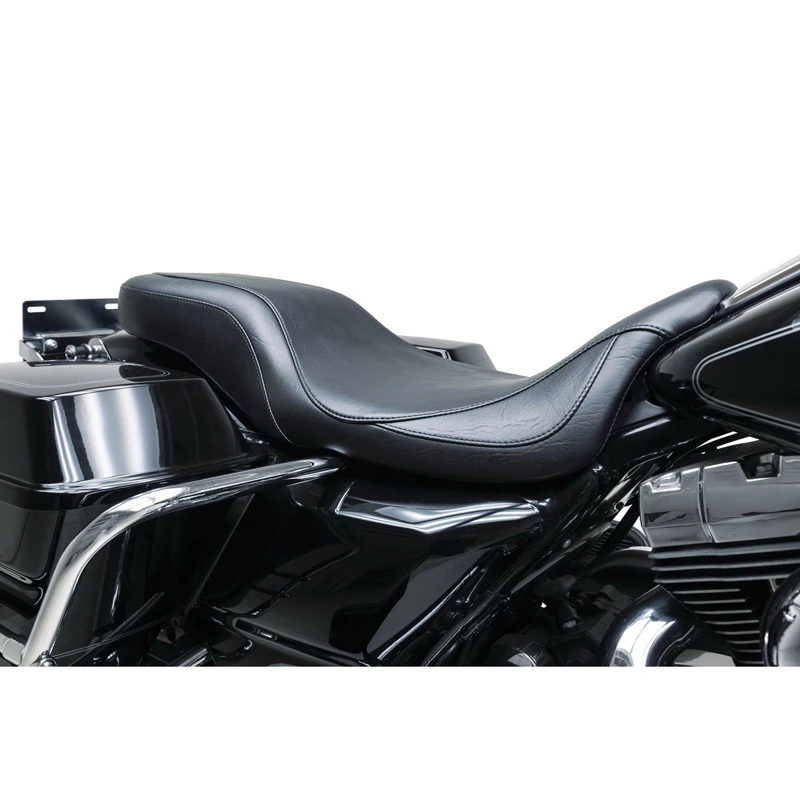 All baseplates for these seats are made of marine-grade, 3/16″ thick fiberglass, finished in high gloss gel coat. All brackets are riveted in place. Exposed brackets are bright chrome plated. Polyurethane rubber bumpers are strategically located and riveted to the baseplate to prevent it from touching the frame and fender and to minimize vibration. Bumpers will not crack with age and are ozone protected. The hidden brackets have a tough, black epoxy powder coat finish and the edges of all baseplates have a steel reinforced, impact absorbing vinyl edge trim to protect the seat cover Mustang’s unique internal support wings are added to the baseplate to provide maximum driver and passenger comfort. These wings support the entire width of the molded foam. This feature is found on most Mustang touring seats. - Baseplates for Mustang Seats for Harley-Davidson®