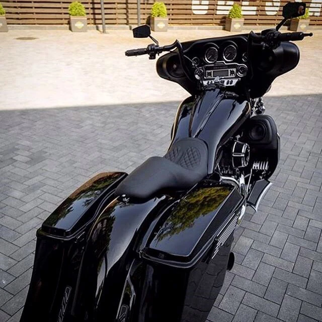 All baseplates for these seats are made of marine-grade, 3/16″ thick fiberglass, finished in high gloss gel coat. All brackets are riveted in place. Exposed brackets are bright chrome plated. Polyurethane rubber bumpers are strategically located and riveted to the baseplate to prevent it from touching the frame and fender and to minimize vibration. Bumpers will not crack with age and are ozone protected. The hidden brackets have a tough, black epoxy powder coat finish and the edges of all baseplates have a steel reinforced, impact absorbing vinyl edge trim to protect the seat cover Mustang’s unique internal support wings are added to the baseplate to provide maximum driver and passenger comfort. These wings support the entire width of the molded foam. This feature is found on most Mustang touring seats. - Baseplates for Mustang Seats for Harley-Davidson®