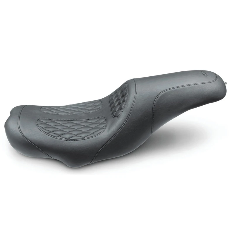 The edges of all baseplates have a steel reinforced, impact absorbing vinyl edge trim to protect the seat cover. Polyurethane bumpers are strategically located and riveted to the baseplate to prevent it from touching the frame and fender and to minimize vibration. Mustang’s unique internal support wings are added to the baseplate to provide maximum driver and passenger comfort. These wings support the entire width of the molded foam. This feature is found on most Mustang touring seats. Bumpers will not crack with age and are ozone protected. Solos with built-in driver backrests have the receiver welded and reinforced to the baseplate for strength. Foam surrounds the hardware to provide maximum comfort.