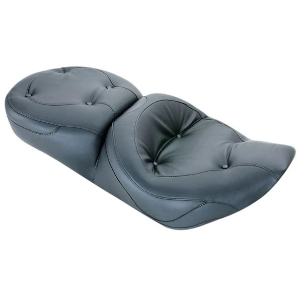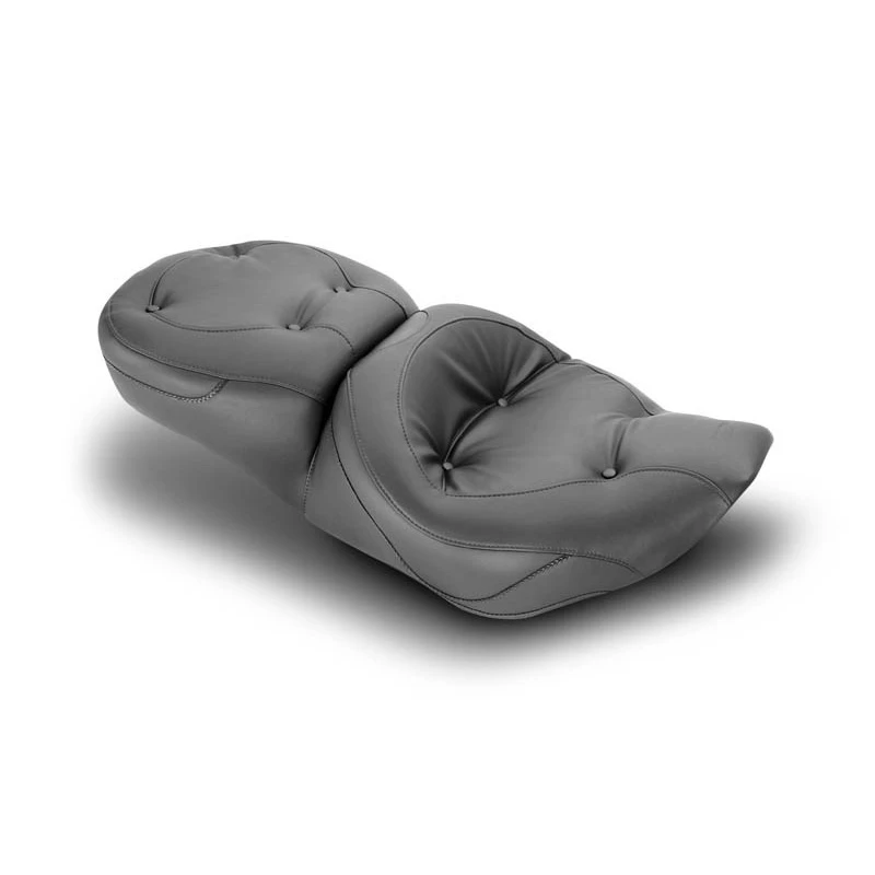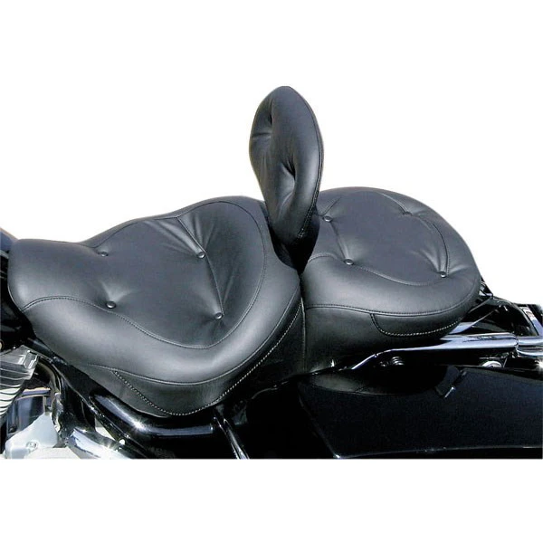 Mustang’s one-piece ultra comfortable touring design provides the rider and passenger with the fullest, most comfortable seat possible. Soft pillow styling is tufted with covered buttons. The seat nose is narrower than stock so that the rider can plant his feet on the ground. The 17″ wide front bucket and the 14″ wide rear seat are available plain or with black pearl-centered chrome studs. The baseplate is open in the middle to accept a Mustang or stock Harley® driver backrest kit. Road King seats will not work with an FLHT handrail. Slotted to accept stock Harley® or Mustang Driver Backrest Kits.