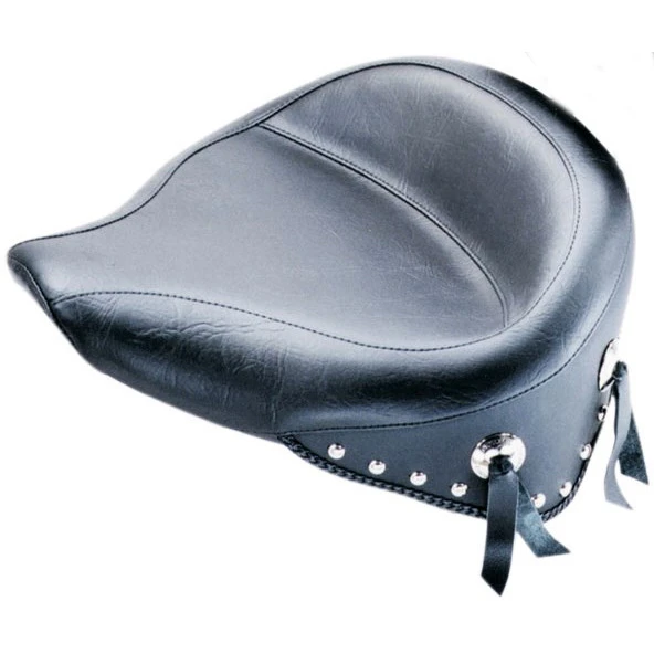 Note:Will not fit with stock passenger seat. The Wide Solos feature a braided edge skirt and are deeply pocketed to provide ample back support. Chrome studs and leather tied conchos.