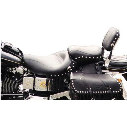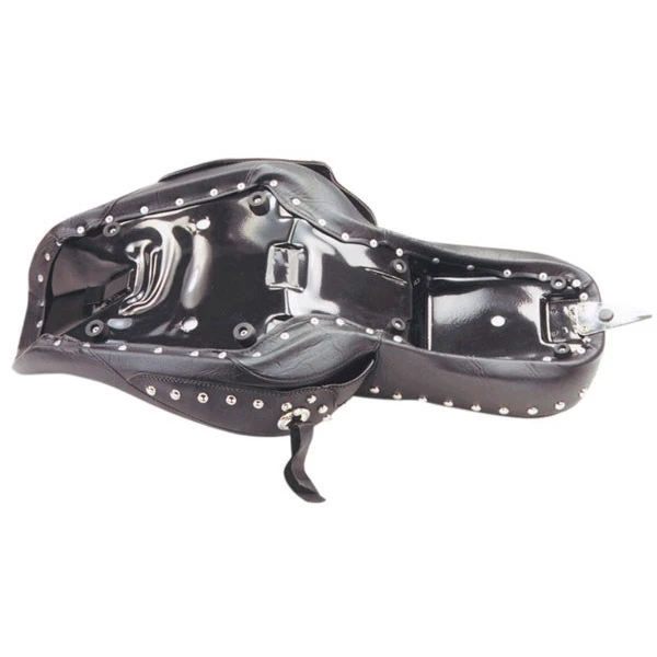 Mustang’s Studded seat has all the features to make it our most popular seat. A full front bucket for the rider, trimmed with a braided edge skirt that comes down over the frame and fender for a clean, uninterrupted look. Passenger seat angles forward to support the rider’s back. Two-piece foam on a single-piece steel base that quickly bolts on using stock locations. Trimmed with chrome studs, conchos tied with leather and sewn-in center panels. New technology adds long distance comfort to the “old” look.