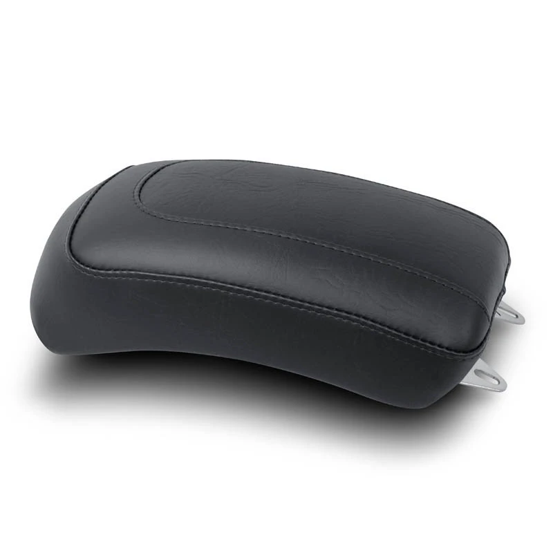 The edges of all baseplates have a steel reinforced, impact absorbing vinyl edge trim to protect the seat cover. Polyurethane bumpers are strategically located and riveted to the baseplate to prevent it from touching the frame and fender and to minimize vibration. Mustang’s unique internal support wings are added to the baseplate to provide maximum driver and passenger comfort. These wings support the entire width of the molded foam. This feature is found on most Mustang touring seats. Bumpers will not crack with age and are ozone protected. Solos with built-in driver backrests have the receiver welded and reinforced to the baseplate for strength. Foam surrounds the hardware to provide maximum comfort.