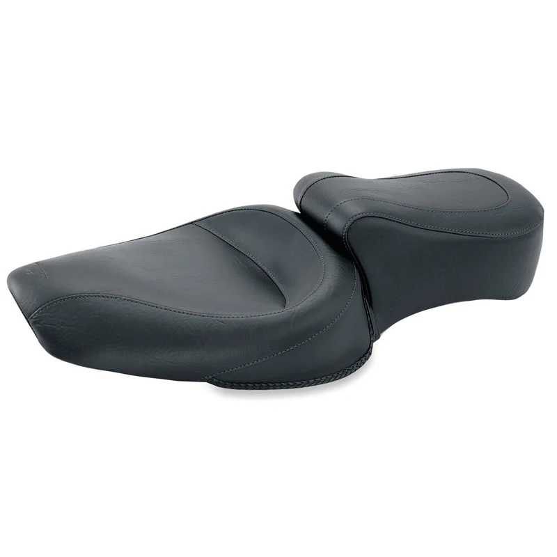 Mustang’s Standard Touring seat offers a 13.5″ wide driver seat with a 9″ passenger seat that extends forward for increased driver back support. Both the original and studded styles are trimmed with a braided edge skirt that comes down over the frame and fender for a clean, uninterrupted look. Two-Piece Seat foam on a single-piece steel base that quickly bolts on using stock locations.