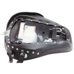 The edges of all baseplates have a steel reinforced, impact absorbing vinyl edge trim to protect the seat cover. Polyurethane bumpers are strategically located and riveted to the baseplate to prevent it from touching the frame and fender and to minimize vibration. Mustang’s unique internal support wings are added to the baseplate to provide maximum driver and passenger comfort. These wings support the entire width of the molded foam. This feature is found on most Mustang touring seats. Bumpers will not crack with age and are ozone protected. Solos with built-in driver backrests have the receiver welded and reinforced to the baseplate for strength. Foam surrounds the hardware to provide maximum comfort.