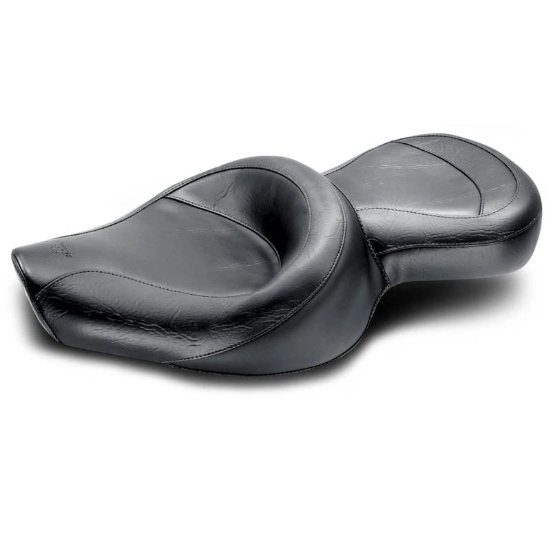 Contoured wings inside the wide molded foam shapes are welded directly to the steel baseplate, effectively doubling the lateral support the seat can offer. Logically, if you put an 11″ wide foam on a 6″ wide fender shape, after an hour of riding in the hot sun, all the passenger will feel is the narrow 6 inches. Mustang seats support the full width of the rider and passenger buckets. Yet outwardly, these Touring seats will exactly match the lines of the frame and fender, keeping a low profile. No other seat comes close to matching the comfort of a Mustang seat on a Sportster. The front bucket has a full skirt with braided edge trim.