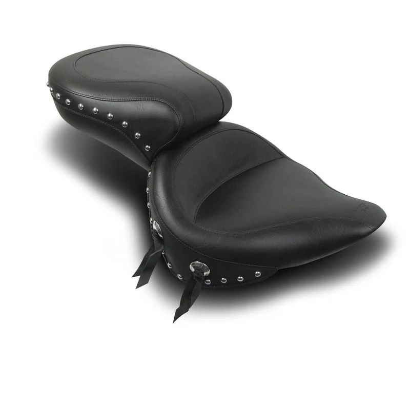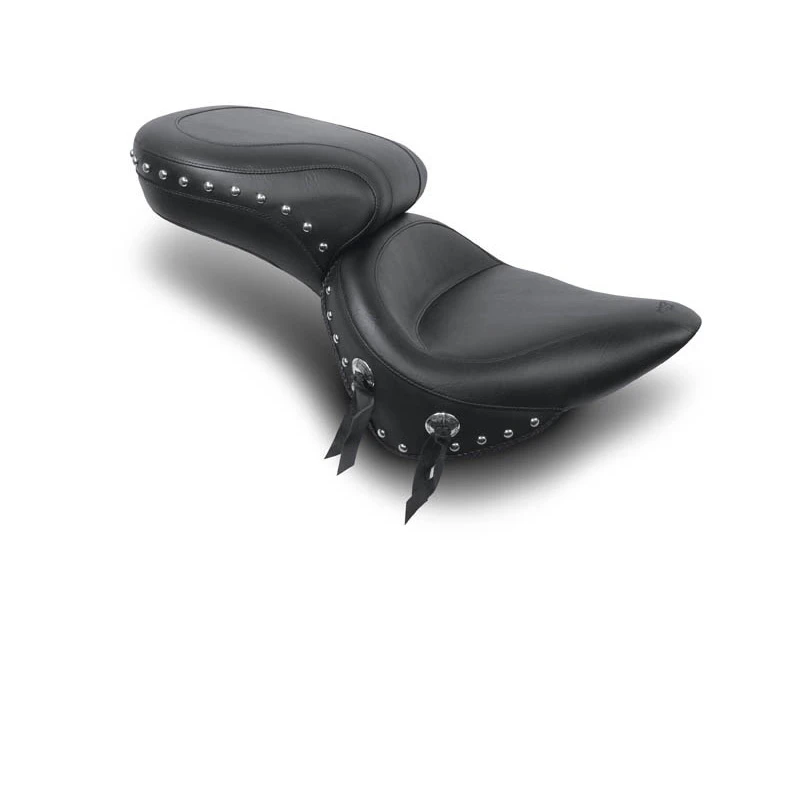 This seat features a wide driver seat that is deeply pocketed and provides ample support. The rear seat also extends forward over the driver’s bucket to give additional back support. The passenger sits comfortably in a full bucket that is shaped like a small solo. The Wide Studded seat has chrome studs all around and the front bucket has a full skirt with braided edge trim and leather tied conchos.