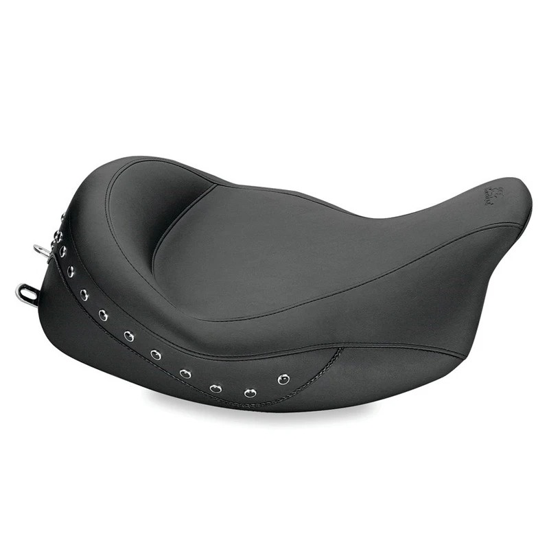 The edges of all baseplates have a steel reinforced, impact absorbing vinyl edge trim to protect the seat cover. Polyurethane bumpers are strategically located and riveted to the baseplate to prevent it from touching the frame and fender and to minimize vibration. Mustang’s unique internal support wings are added to the baseplate to provide maximum driver and passenger comfort. These wings support the entire width of the molded foam. This feature is found on most Mustang touring seats. Bumpers will not crack with age and are ozone protected. Solos with built-in driver backrests have the receiver welded and reinforced to the baseplate for strength. Foam surrounds the hardware to provide maximum comfort.