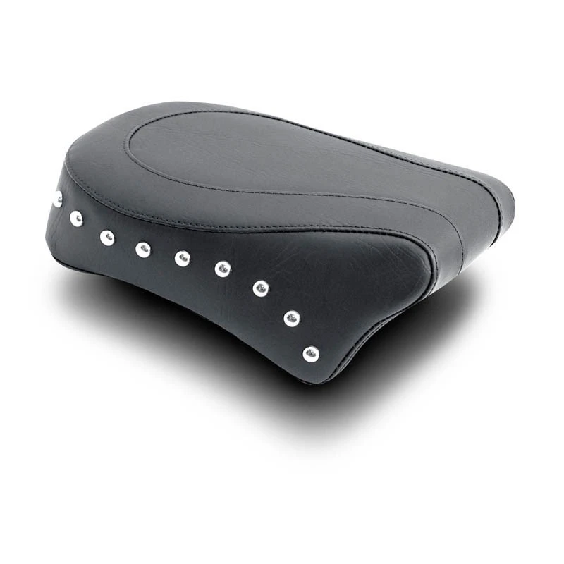 Note:Will not fit with stock solo seat. More padding for passenger comfort. Angles forward to provide additional driver back support. Features chrome studs.