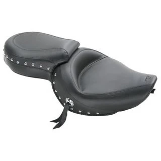 The One-Piece Wide Touring seat features a wide driver seat that is deeply pocketed and provides ample back support. The wide passenger seat also extends forward over the driver’s seat to give additional back support. The Wide Studded features chrome studs all around. The front bucket has a full skirt with braided edge trim and leather tied conchos.