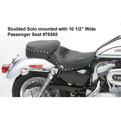Mustang offers a solo for the Harley-Davidson® XL Sportster 2004-2015, for 2.1 & 3.3 gallon tanks, with a braided edge skirt and features chrome studs and leather tied conchos.