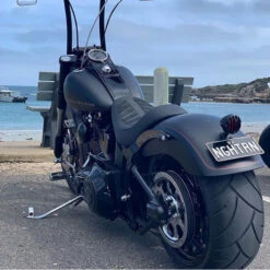 Formed 16 gauge steel baseplates are black epoxy powder coated on both sides for complete rust proofing. Carpet protects fender paint. Exposed brackets are bright chrome plated.NOTE: FLHT/FLHR Ultra and 2006-up Dyna baseplates are made of marine-grade fiberglass 3/16″ thick finished in high gloss gel coat. This allows for the use of a fender mounted driver backrest kit.