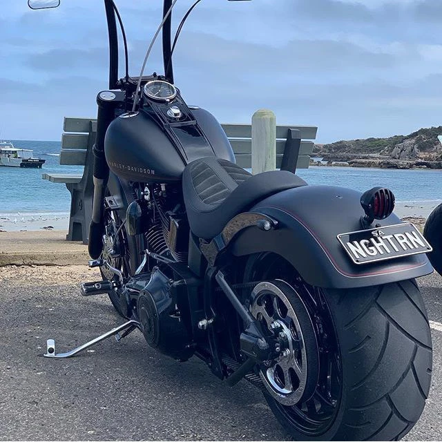 All baseplates for these seats are made of marine-grade, 3/16″ thick fiberglass, finished in high gloss gel coat. All brackets are riveted in place. Exposed brackets are bright chrome plated. Polyurethane rubber bumpers are strategically located and riveted to the baseplate to prevent it from touching the frame and fender and to minimize vibration. Bumpers will not crack with age and are ozone protected. The hidden brackets have a tough, black epoxy powder coat finish and the edges of all baseplates have a steel reinforced, impact absorbing vinyl edge trim to protect the seat cover Mustang’s unique internal support wings are added to the baseplate to provide maximum driver and passenger comfort. These wings support the entire width of the molded foam. This feature is found on most Mustang touring seats. - Baseplates for Mustang Seats for Harley-Davidson®